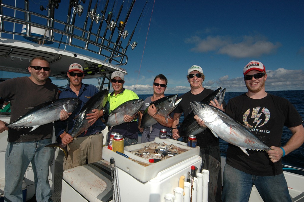 There is a daily catch limit of 6 tuna only per trip, or 2 tuna per person, with a maximum of 6 tuna per trip. With 8 people on board everyone catches tuna with any fish over six released to fight another day. The six tuna we keep are divided evenly over the eight people.